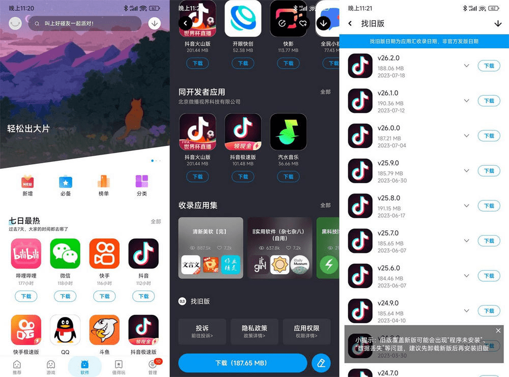 AppChina应用汇为用户提供最新、最全面的安卓软件和游戏下载资源,丰富手机应用与游戏体验。支持下载手机旧版app,打开应用汇某个APP下载页,往下拉到底可以看到“找旧版”按钮。即可下载该APP的旧版本,甚至几年前的安装包都有。如今的APP普遍存在,越更新越臃肿问题,所以有时需要停留在旧版。历史版本下载功能,提供了很大便利,我们不用再到处寻找安装包。