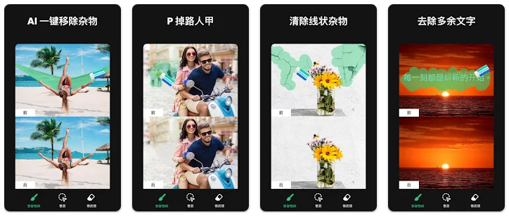 Pic Retouch这是一款手机照片后期软件,可以帮助用户对图片中的内容进行去除,你可以让软件自动识别,使用AI去除,也可以自己手动选择要去除的杂物,支持水印和一些乱七八糟的物品,去除的操作非常的丝滑,不会让图片变得异样,非常的自然。