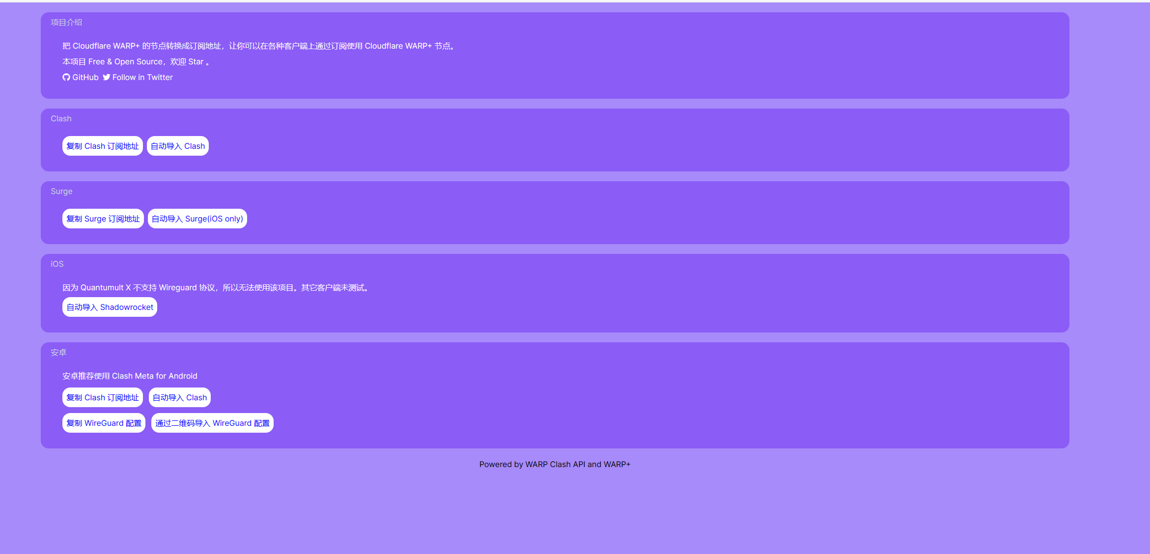 WARP Clash API是一个可以让你通过订阅的方式使用Cloudflare WARP+免费密钥的流量,支持