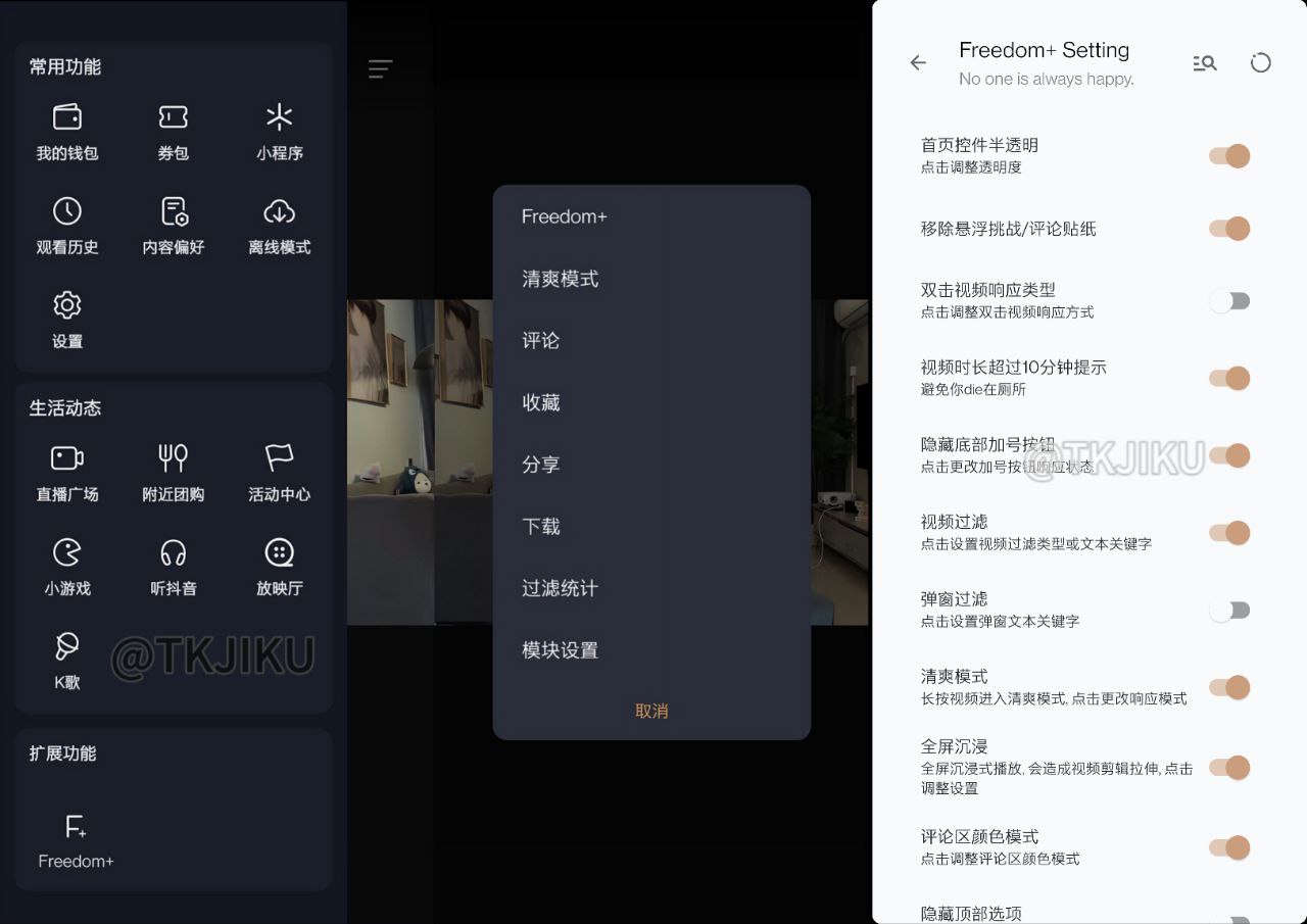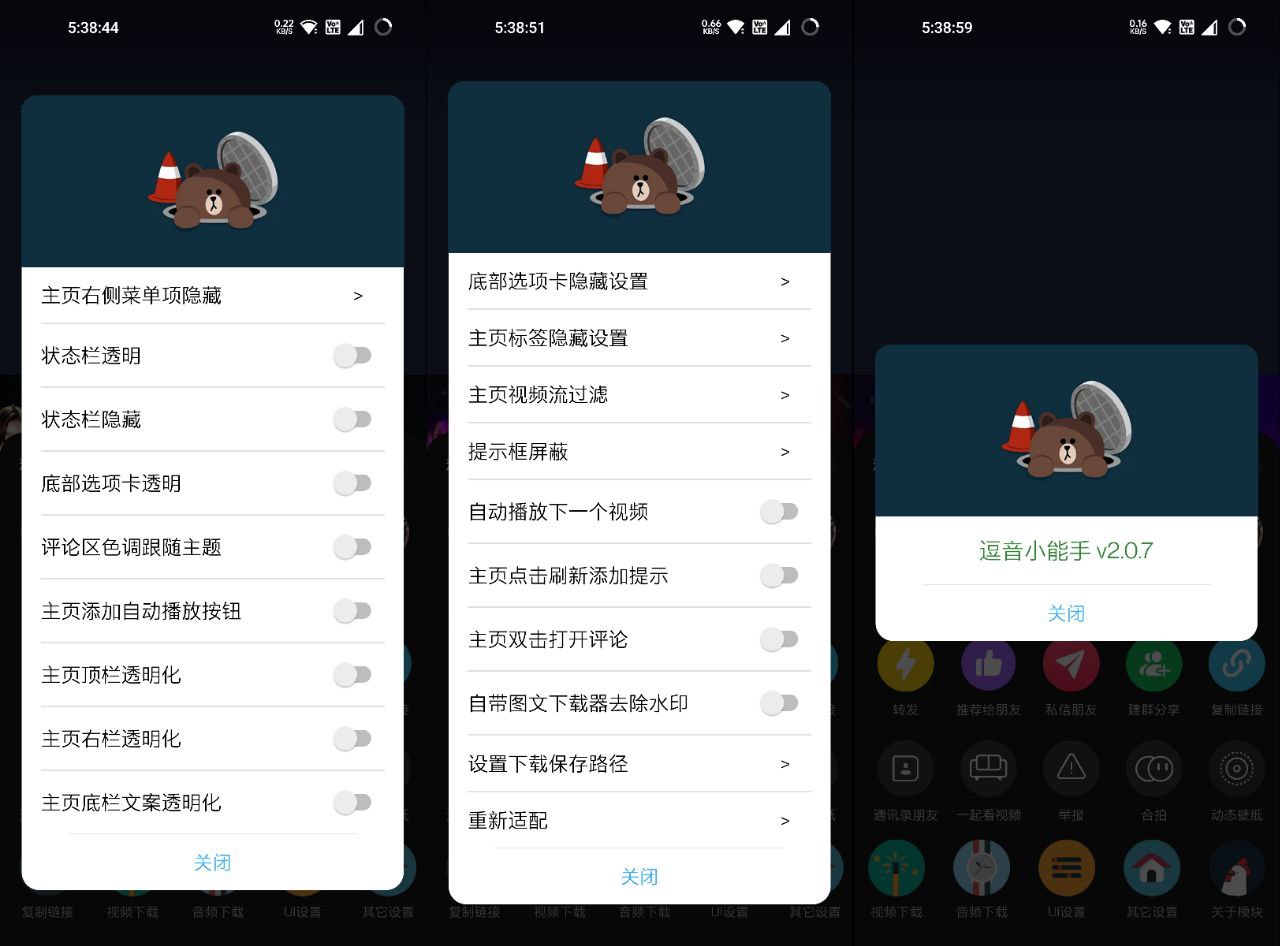 使用说明:首次使用或版本更新后会弹出适配弹窗,适配完成重启抖音生效;抖音首页视频界面点击分享按钮查看功能设置